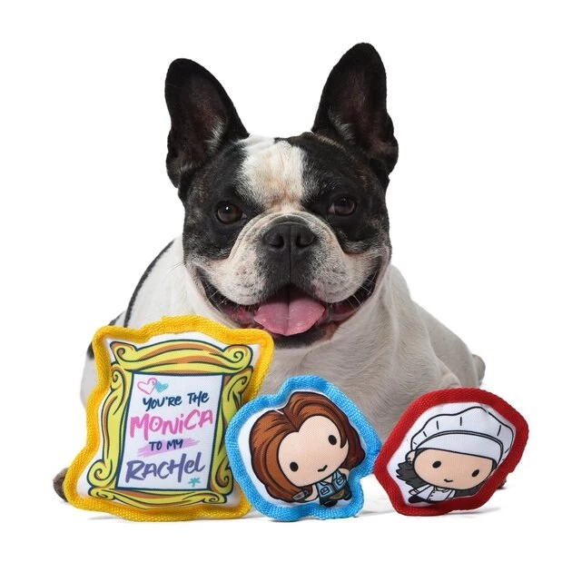 Share your love of the iconic series “Friends” with your own furry friend when you bring home this Fetch For Pets Friends V-Day “Better Together” Canvas Squeaky Dog Toy set. This whimsical set includes 3 canvas toys–Rachel, Monica, and the iconic peephole yellow frame from the apartment that says, “Together is Better” on one side and “You’re the Monica to my Rachel!” on the other side. Settle in for a marathon of your favorite episodes while your best bud fetches, tosses, carries, and chews on their new toys.