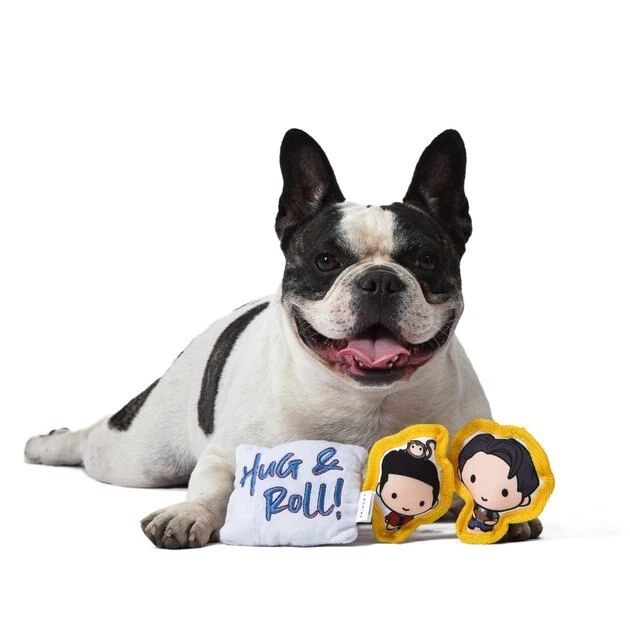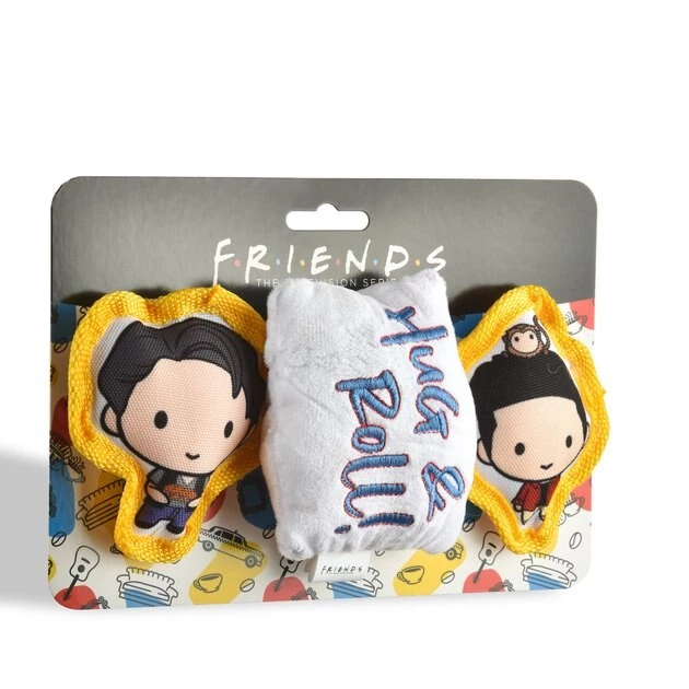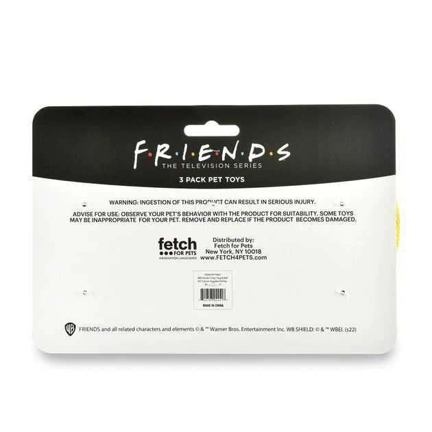 Share your love of the iconic series “Friends” with your own furry friend when you bring home this Fetch For Pets Friends V-Day “Hug & Roll” Canvas Squeaky Dog Toy set. This whimsical set includes 3 canvas toys–Ross, Chandler, and a pillow that proclaims, “Hug & Roll.” Settle in for a marathon of your favorite episodes while your best bud fetches, tosses, carries, and chews on their new toys.