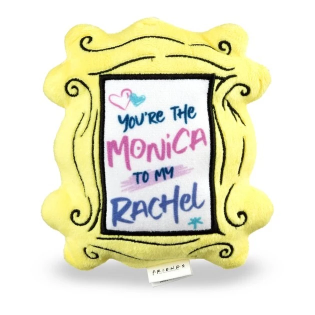 Share your love of the iconic series “Friends” with your own furry friend when you bring home this Fetch For Pets Friends You’re Better Together Frame Plush Squeaky Dog Toy. This whimsical toy features the iconic peephole yellow frame from the apartment that says, “Together is Better” on one side and “You’re the Monica to my Rachel!” on the other side. Settle in for a marathon of your favorite episodes while your best bud fetches, tosses, carries, and chews on their new toy.