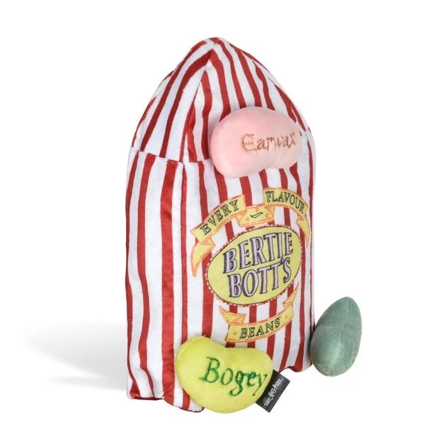 - Screen-printed and embroidered with Bertie Botts Every Flavor Beans designs, including three plush bean-shaped toys.