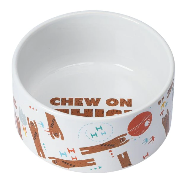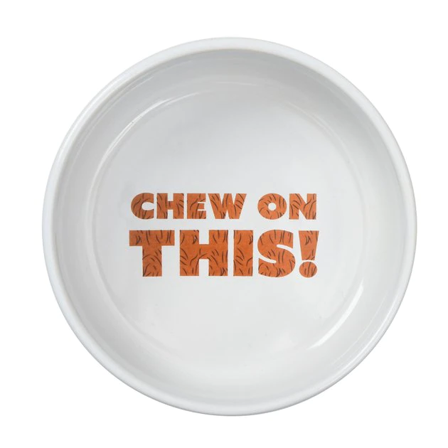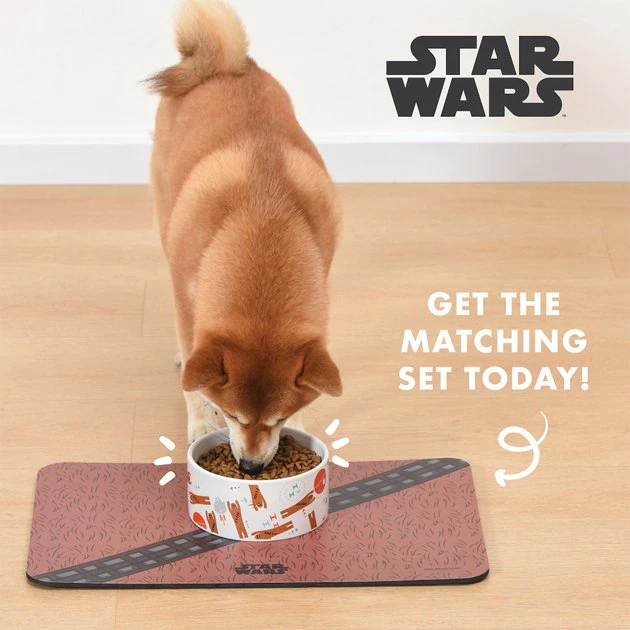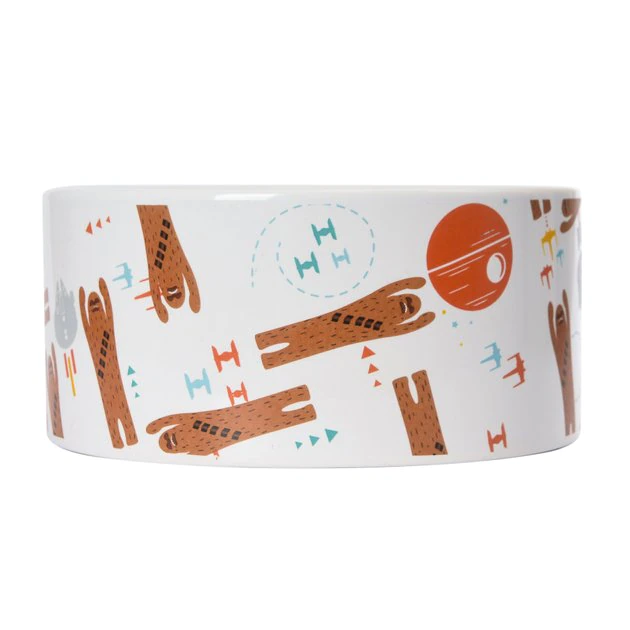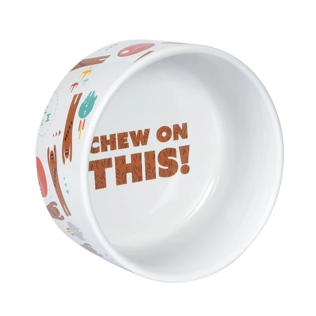 Let your furry friend feast from a bowl that is paw-fect for the biggest Star Wars enthusiasts in the galaxy! Fetch For Pets Star Wars Chewbacca “Chew On This” Dog Bowl is an officially licensed Star Wars bowl that is perfect for serving water, treats, wet food, or dry food. Featuring “Chew on This” wording and cute Star Wars themed designs, this bowl is made of a durable, glazed ceramic that can withstand daily use. It can also be safely cleaned in the top rack of the dishwasher for convenient and sanitary care. This chic, intergalactic bowl is ideal for giving your furry friend her favorite treats or kibble—while letting her show off her love for her favorite Star Wars characters!