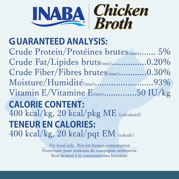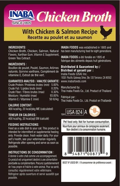 Fulfill your feline friend’s wish for a new dish with Inaba Chicken Broth Chicken & Salmon Recipe Grain-Free Cat Food Topper. This tasty food topper for cats is crafted with 100% natural shredded chicken breast and wild-caught Pacific salmon flakes in a savory chicken gravy. It features an enticing aroma and irresistible taste that’s low in calories and high in moisture. This cat food topper is formulated to be free from grains, corn, wheat, soy, preservatives and artificial colors using only carefully selected ingredients for maximum fur-eshness.