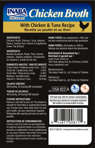 Add some appeal to your pal’s meal with Inaba Chicken Broth Chicken & Tuna Recipe Grain-Free Cat Food Topper. This tasty food topper for cats is crafted with 100% natural shredded chicken breast and wild-caught tuna flakes in a savory chicken gravy. It features an enticing aroma and irresistible taste that’s low in calories and high in moisture. This cat food topper is formulated to be free from grains, corn, wheat, soy, preservatives and artificial colors using only carefully selected ingredients for maximum fur-eshness.