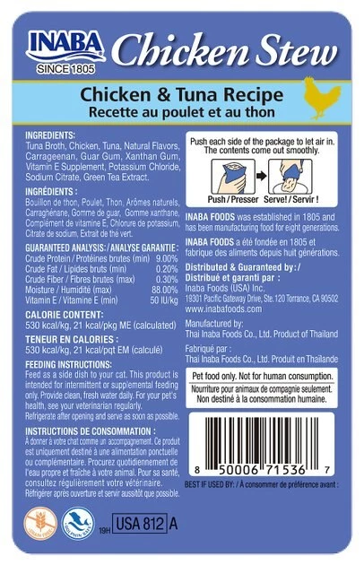 Add some flair to your kitty’s fare with Inaba Chicken Stew Chicken & Tuna Recipe Grain-Free Cat Food Topper. This tasty food topper for cats is crafted with 100% natural shredded chicken breast and wild-caught tuna flakes in a savory chicken gelée. It features an enticing aroma and irresistible taste that’s low in calories and high in moisture. This cat food topper is formulated to be free from grains, corn, wheat, soy, preservatives and artificial colors using only carefully selected ingredients for maximum fur-eshness.