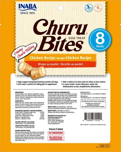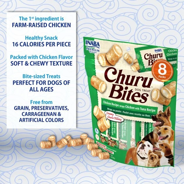 Make a move towards more yummy, healthy treats with Inaba Churu Bites Wraps Chicken Recipe Grain-Free Soft & Chewy Dog Treats. Made first and foremost with 100% real farm-raised chicken and wild tuna, you won’t find any yucky grains, preservatives, or artificial colors taking up space in this tasty treat. Two textures, including the creamy Churu filling on the inside and the baked chicken paste on the outside, are ideal for picky eaters—plus your pup will be getting nutritious green tea extract and vitamin E. They’re the perfect healthy treat to keep your dog interested while amping up that flavor game!