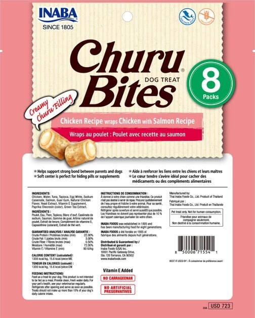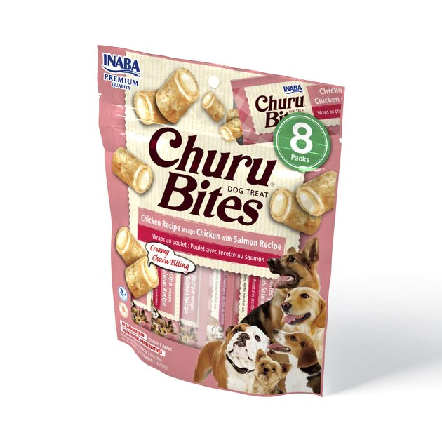 Make a move towards more yummy, healthy treats with Inaba Churu Bites Wraps Chicken with Salmon Recipe Grain-Free Soft & Chewy Dog Treats. Made first and foremost with 100% real farm-raised chicken, wild tuna, and pacific salmon, you won’t find any yucky grains, preservatives, or artificial colors taking up space in this tasty treat. Two textures, including the creamy Churu filling on the inside and the baked chicken paste on the outside, are ideal for picky eaters—plus your pup will be getting nutritious green tea extract and vitamin E. They’re the perfect healthy treat to keep your dog interested while amping up that flavor game!