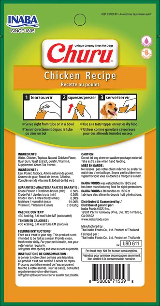 Take yummy treats up a notch with Inaba Churu Chicken Puree Grain-Free Lickable Dog Treat. Made first and foremost with 100% real farm-raised chicken, you won’t find any yucky grains, preservatives, or artificial colors taking up space in this tasty treat. The creamy texture and savory flavor are ideal for picky eaters—simply tear open the tube and squeeze to feed this puree by hand. They even make a perfect topper for meals to amp up your flavor game!