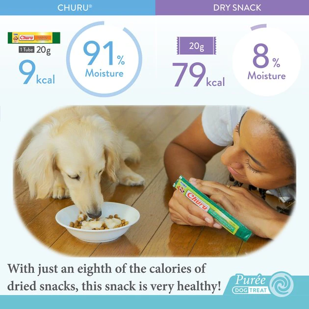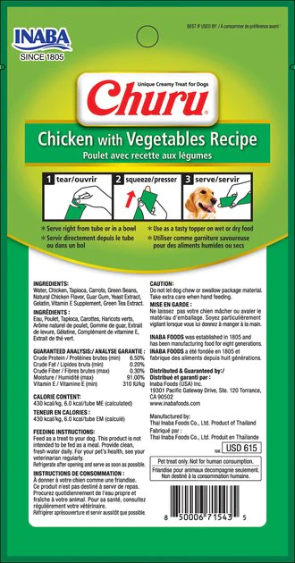 Take yummy treats up a notch with Inaba Churu Chicken with Vegetable Puree Grain-Free Lickable Dog Treat. Made first and foremost with 100% real farm-raised chicken, you won’t find any yucky grains, preservatives, or artificial colors taking up space in this tasty treat. The creamy texture and savory flavor are ideal for picky eaters—simply tear open the tube and squeeze to feed this puree by hand. They even make a perfect topper for meals to amp up your flavor game!