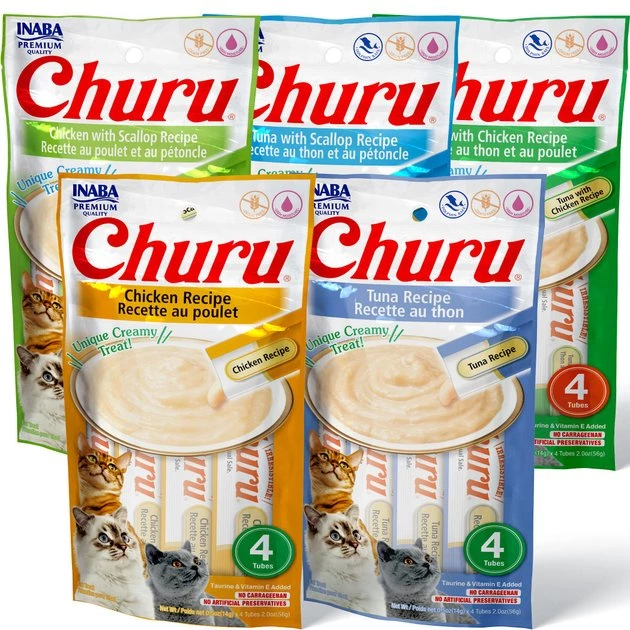 Treat your kitty to the lickable yumminess he craves with the Inaba Churu Grain-Free Chicken, Tuna, Scallop Puree Variety Pack Lickable Cat Treat. “Churu churu” means “slurp slurp”—which, in cat language translates as purr-fectly delicious. And he’ll love slurping up the creamy treats, made with real meats like farm-raised chicken and deep sea tuna for the protein-packed flavor your pal will be purring for. It’s also got vitamin E for a boost of nutrition, and no kitty junk food like grains or artificial ingredients. Just tear, squeeze and feed right from the tube or into a bowl—you can even add it to his meals, especially if he’s picky! Not only is it a burst of purr deliciousness in every tube, but it’s also a great way to add hydration to support overall well-being, from tails to whiskers.