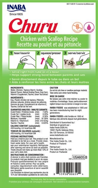 Treat your kitty to the lickable yumminess he craves with the Inaba Churu Grain-Free Chicken with Scallop Puree Lickable Cat Treat. “Churu churu” means “slurp slurp”—which, in cat language translates as purr-fectly delicious. And he’ll love slurping the creamy treat, made with real, farm-raised chicken and scallops for the protein-packed flavor your pal will be purring for. It’s also got vitamin E for a boost of nutrition, and no kitty junk food like grains or artificial ingredients. Just tear, squeeze and feed right from the tube or into a bowl—you can even add it to his meals, especially if he’s picky! Not only is it a burst of purr deliciousness in every tube, but it’s also a great way to add hydration to support overall well-being, from tails to whiskers.