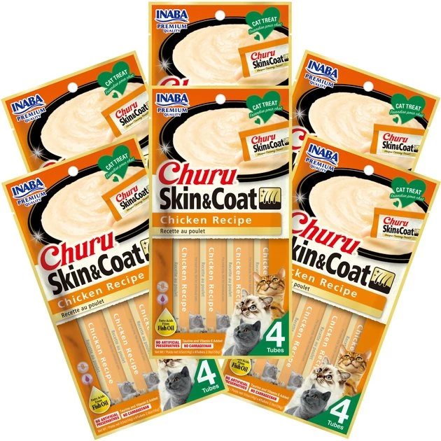 Nourish your kitty from the inside out by rewarding her with an Inaba Churu Grain-Free Skin & Coat Chicken Recipe Lickable Cat Treat! These purr-worthy goodies are made with farm-raised chicken. Omega-3 fatty acids from fish oil help maintain skin and coat health, while the lickable formula offers your feline friend the moisture she needs for overall health. Your kitty will love the creamy texture and savory flavor and you’ll love knowing that these treats are 100% free from grains, preservatives and artificial colors. To feed by hand, simply tear the tube open and give it a squeeze! You can also pour these rewards into a bowl or use them as a tasty topper on wet or dry food.