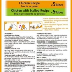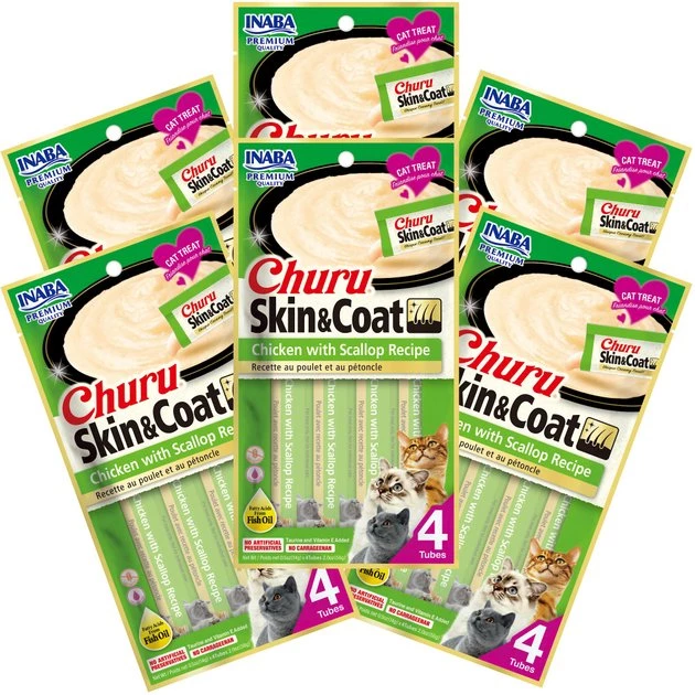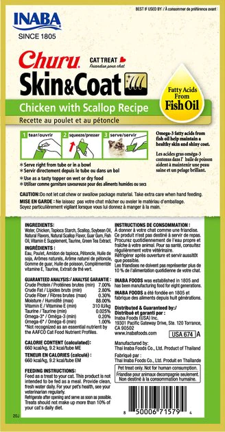 Nourish your kitty from the inside out by rewarding her with an Inaba Churu Grain-Free Skin & Coat Chicken with Scallop Recipe Lickable Cat Treat! These purr-worthy goodies are made with farm-raised chicken and scallop. Omega-3 fatty acids from fish oil help maintain skin and coat health, while the lickable formula offers your feline friend the moisture she needs for overall health. Your kitty will love the creamy texture and savory flavor and you’ll love knowing that these treats are 100% free from grains, preservatives and artificial colors. To feed by hand, simply tear the tube open and give it a squeeze! You can also pour these rewards into a bowl or use them as a tasty topper on wet or dry food.