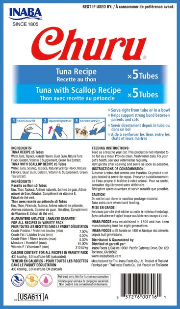 Treat your favorite feline to the scrumptious flavors and wholesome nutrition of Inaba’s Churu Tuna & Tuna with Scallop Puree Variety Pack. It comes with 10 individually wrapped tubes of creamy, purr-worthy puree in two lip-smacking flavors—Tuna, and Tuna with Scallop. Both recipes are rich in moisture, so your paw-tner can get the hydration she needs in her diet to support her overall health. And with zero grains, artificial preservatives or colors, you can feel good feeding Inaba’s lickable cat treats to your furry purr-incess! Simply tear the tube open and squeeze to feed by hand, pour in a bowl or use as a tasty topper for your kitty’s favorite kibble.