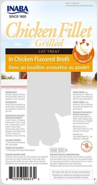 Turn mealtime into yum time with the Inaba Ciao Grain-Free Grilled Chicken Fillet in Chicken Flavored Broth Cat Treat. “Ciao delicious!” your hangry kitty will say when you serve up this hand-cut, lightly-grilled fillet of farm-raised chicken, packed with flavorful protein fit for your little carnivore. The ingredients list is simple—with real meat, broth and added vitamin E for a boost of nutrition in every meaty, tender bite, with zero junk ingredients like grains or anything artificial. It’s great as an anytime treat or snack, or as a food topper to make meals simply irresistible. Plus, since it’s made with real broth, it adds plenty of moisture to help keep your kitty hydrated and support his well-being, tail to whiskers.
