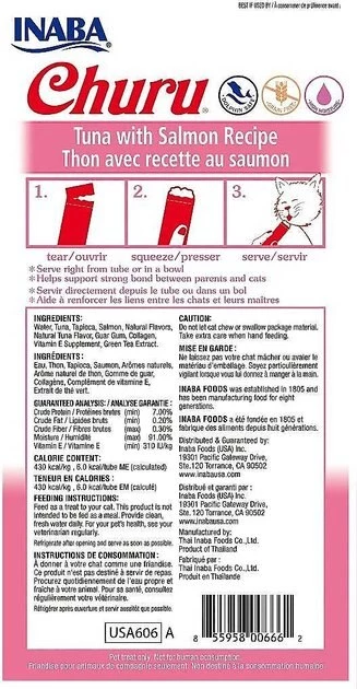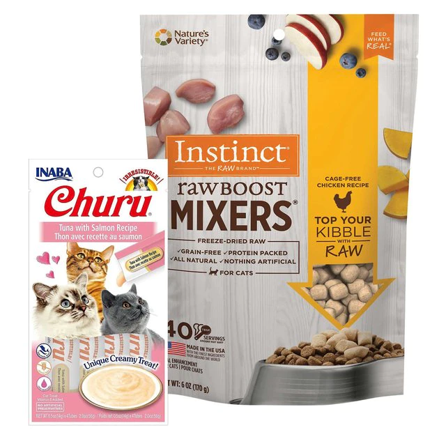 - This duo includes Inaba Churu Grain-Free Tuna with Salmon Puree Lickable Cat Treat and Instinct Raw Boost Mixers Chicken Recipe Grain-Free Freeze-Dried Cat Food Topper.