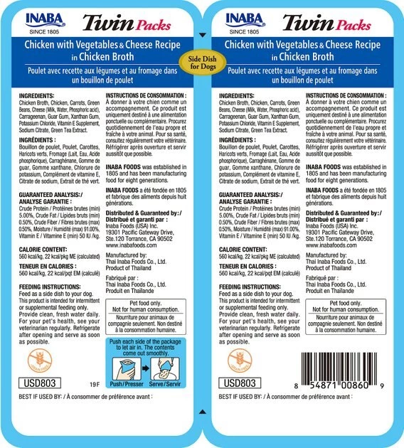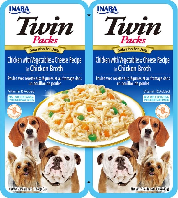 Make sure that your pupper loves his supper using Inaba Twin Packs Chicken with Vegetables & Cheese Recipe in Chicken Broth Grain-Free Dog Food Topper. This tasty food topper for dogs is crafted with shredded chicken breast, creamy cheese and garden vegetables in a savory chicken broth gelée. It features an enticing aroma and irresistible taste that’s low in calories and high in moisture. This dog food topper is formulated to be free from grains, corn, wheat, soy, preservatives and artificial colors using only carefully selected ingredients for maximum fur-eshness.