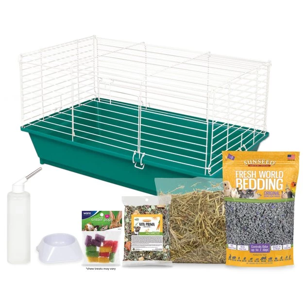 Kit Sunseed Vita Prima Rabbit Food, Sunseed Fresh World Pet Bedding, Timothy Hay, Assorted Chew Treats, Water Bottle, Rabbit Cage, No-Tip Food Bowl.