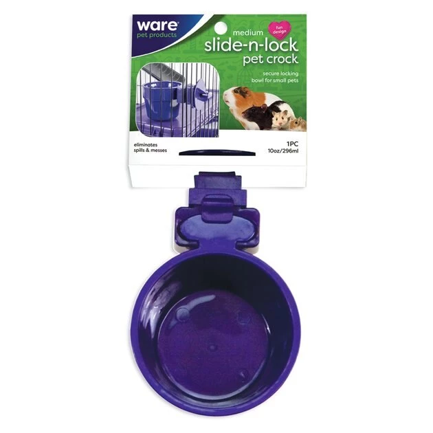 The Slide-N-Lock Pet Crocks feature a low profile to give pets easy access to food and water. They are made of chew resistant, heavy duty plastic and are easy to attach to any cage (just slide and lock) and easy to clean. The Slide-N-Lock Crock eliminates spills and wasted food.